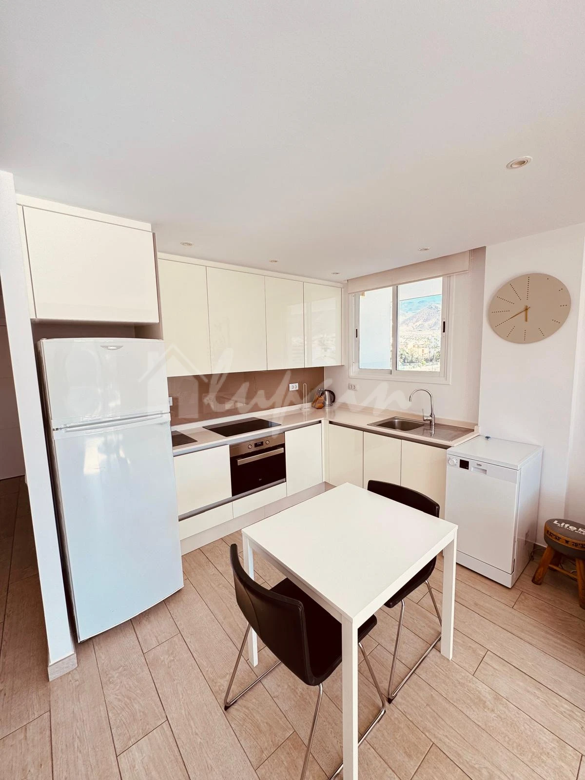 A charming frontline apartment located in the highly sought-after Comodoro complex in Los Cristianos. The property features one spacious bedroom with fitted wardrobes and one bathroom. It offers a fully fitted and equipped open-plan American-style kitchen, seamlessly connected to the bright lounge and dining area. Patio doors open onto a private terrace boasting beautiful sea and mountain views.