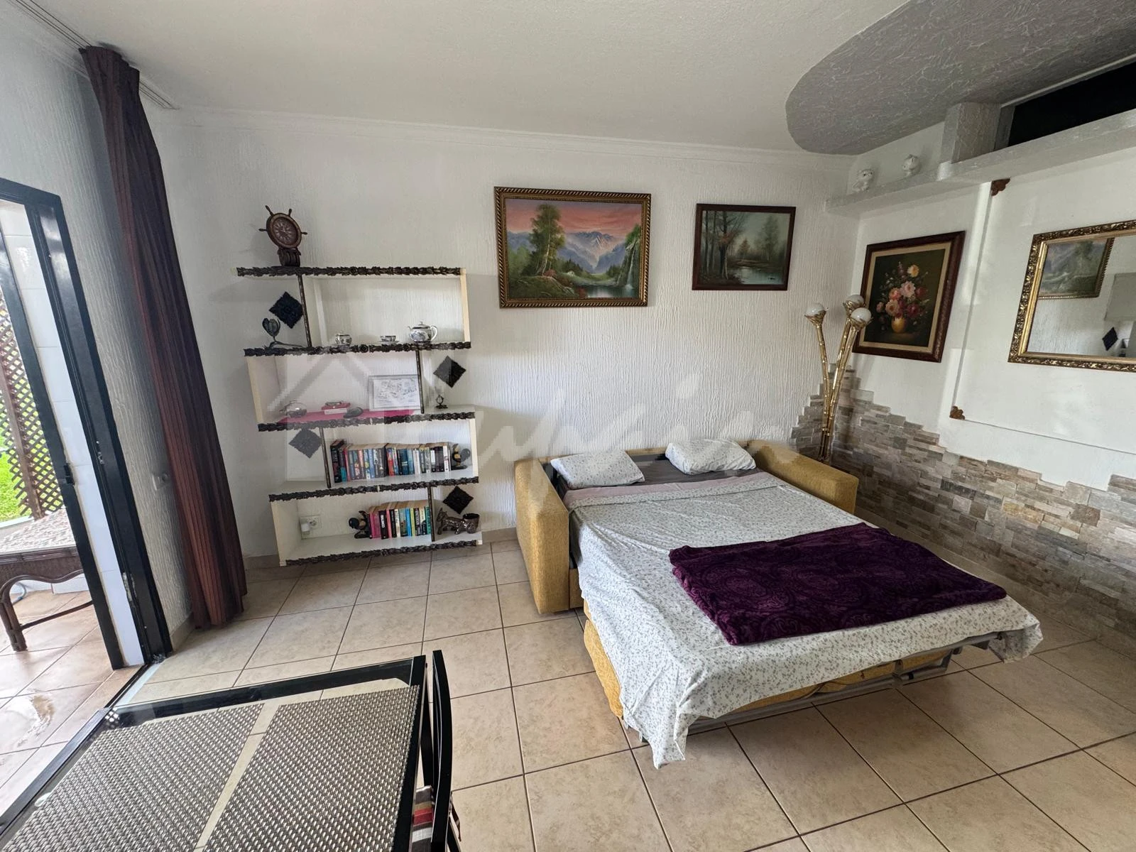 The property offers 42 m² of internal living space, comprising 1 bedroom, a bright and comfortable living area, fully equipped kitchen, and a full bathroom with bathtub. The living room opens onto a private 11 m² terrace with direct access to the communal garden, providing an excellent outdoor space to enjoy the year-round mild climate.