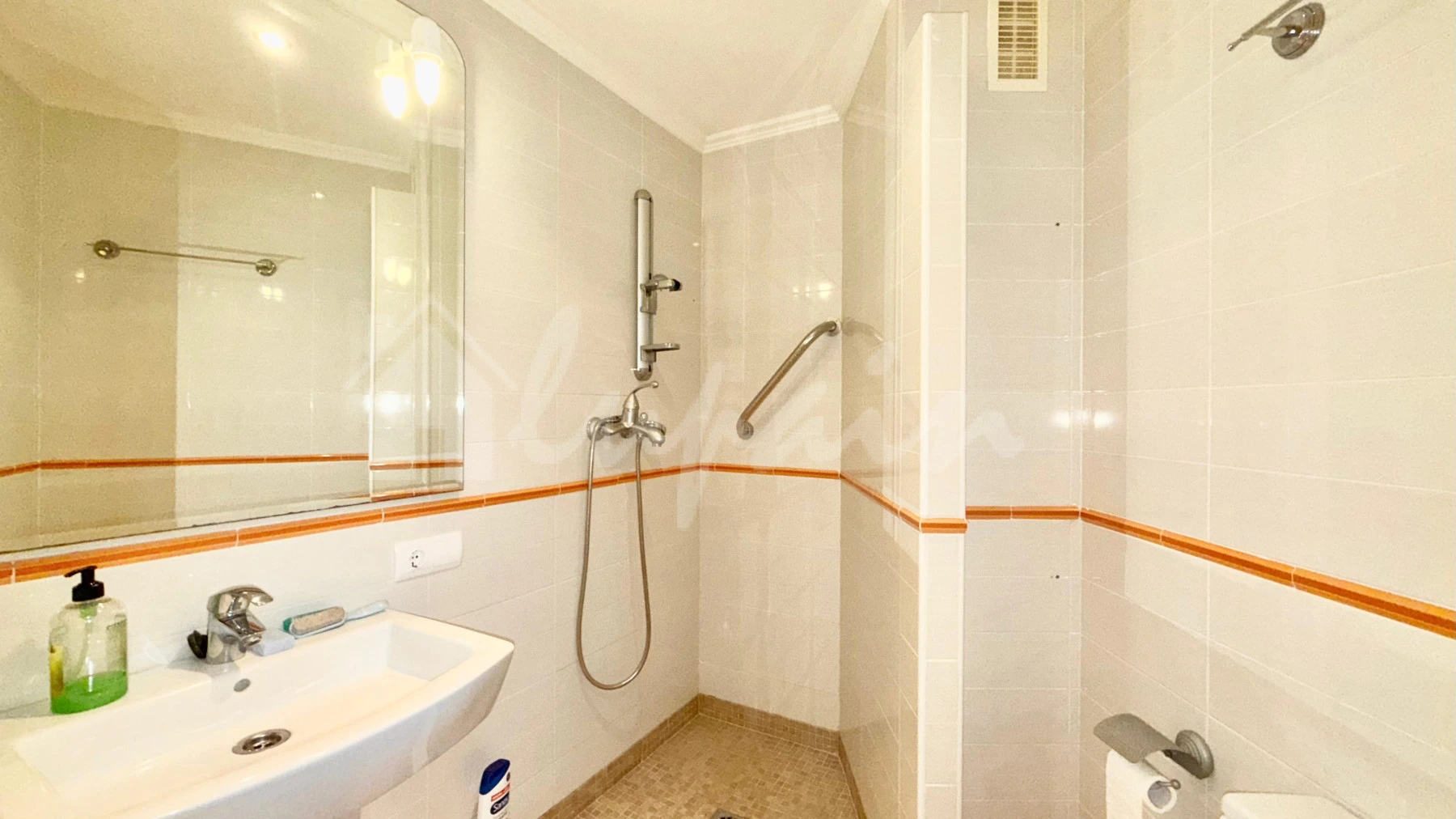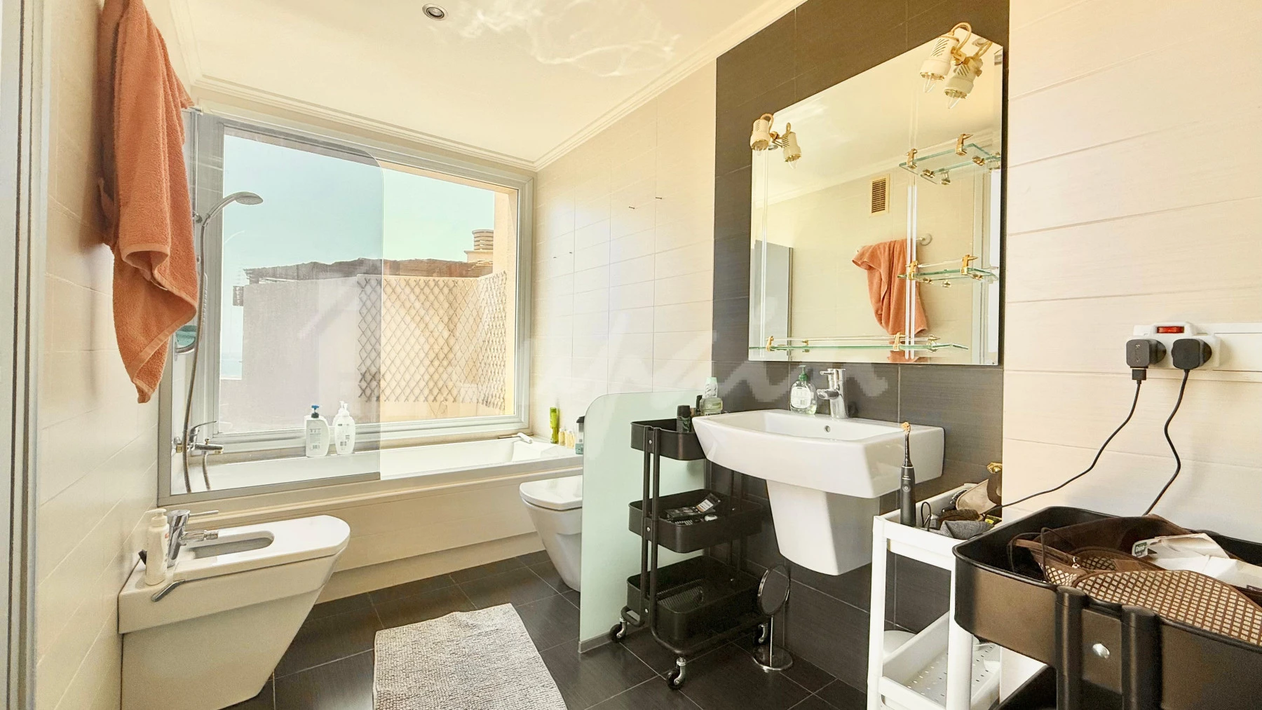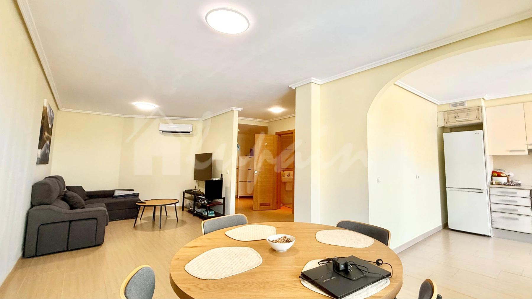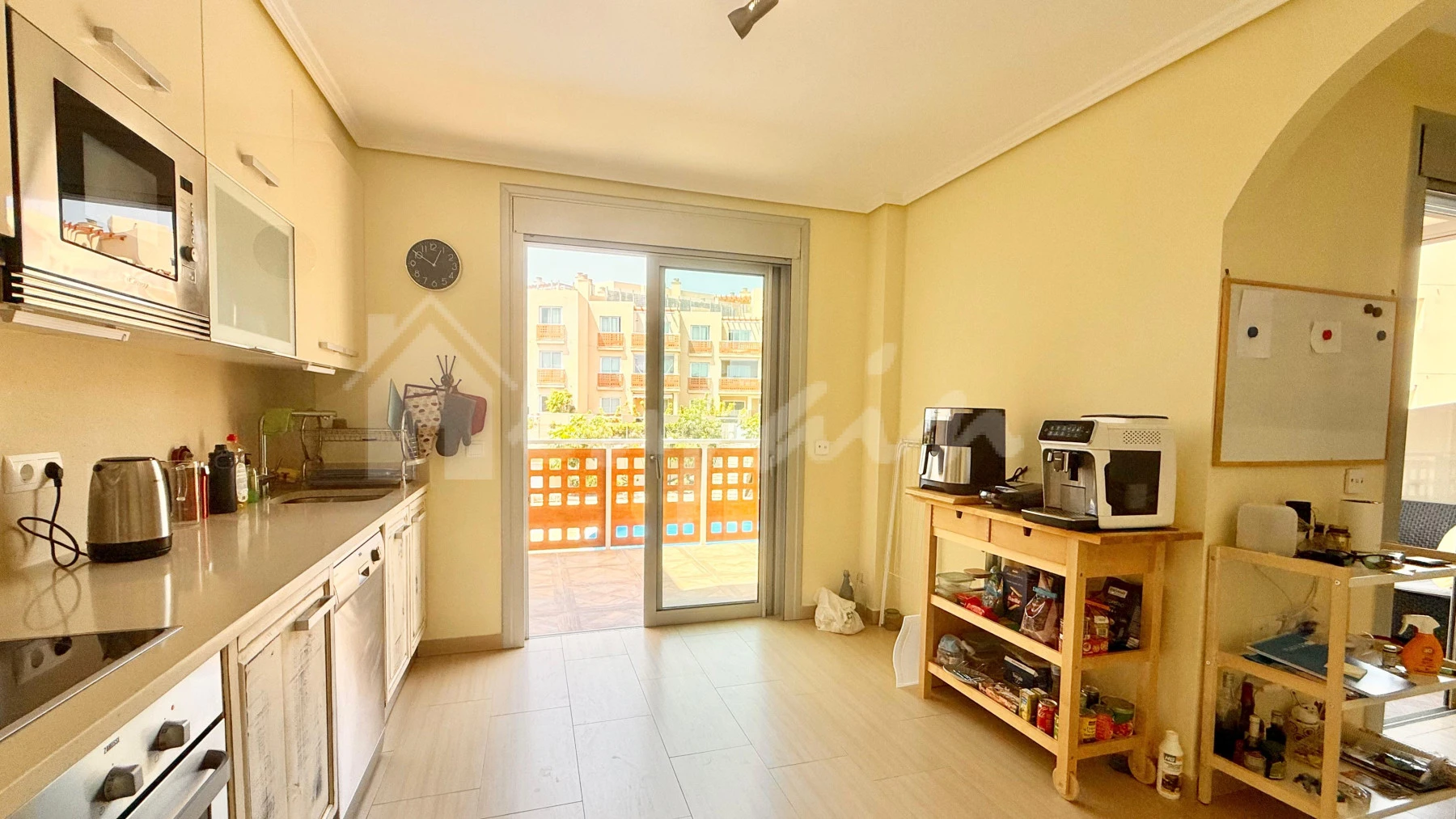 The modern American-style kitchen comes fully fitted and equipped, seamlessly connecting to a bright lounge and dining area. Large patio doors open onto one of the apartment’s three terraces, each offering pleasant views of the communal pool. A private rooftop terrace further enhances the property, boasting spectacular sea and mountain vistas.