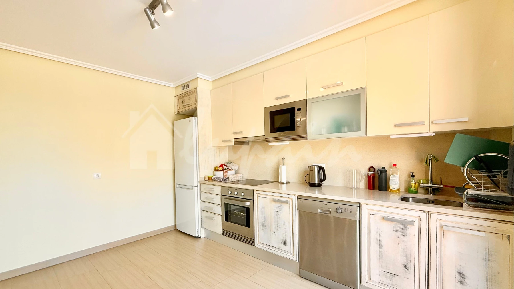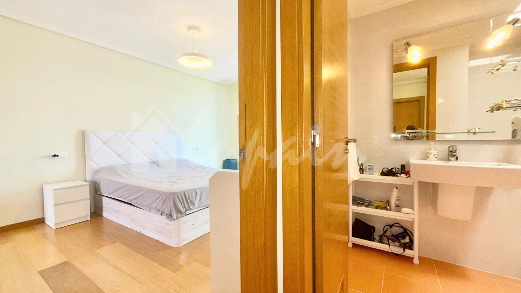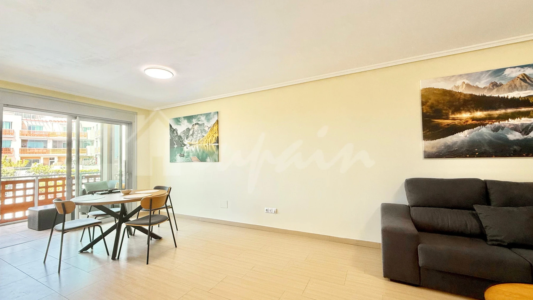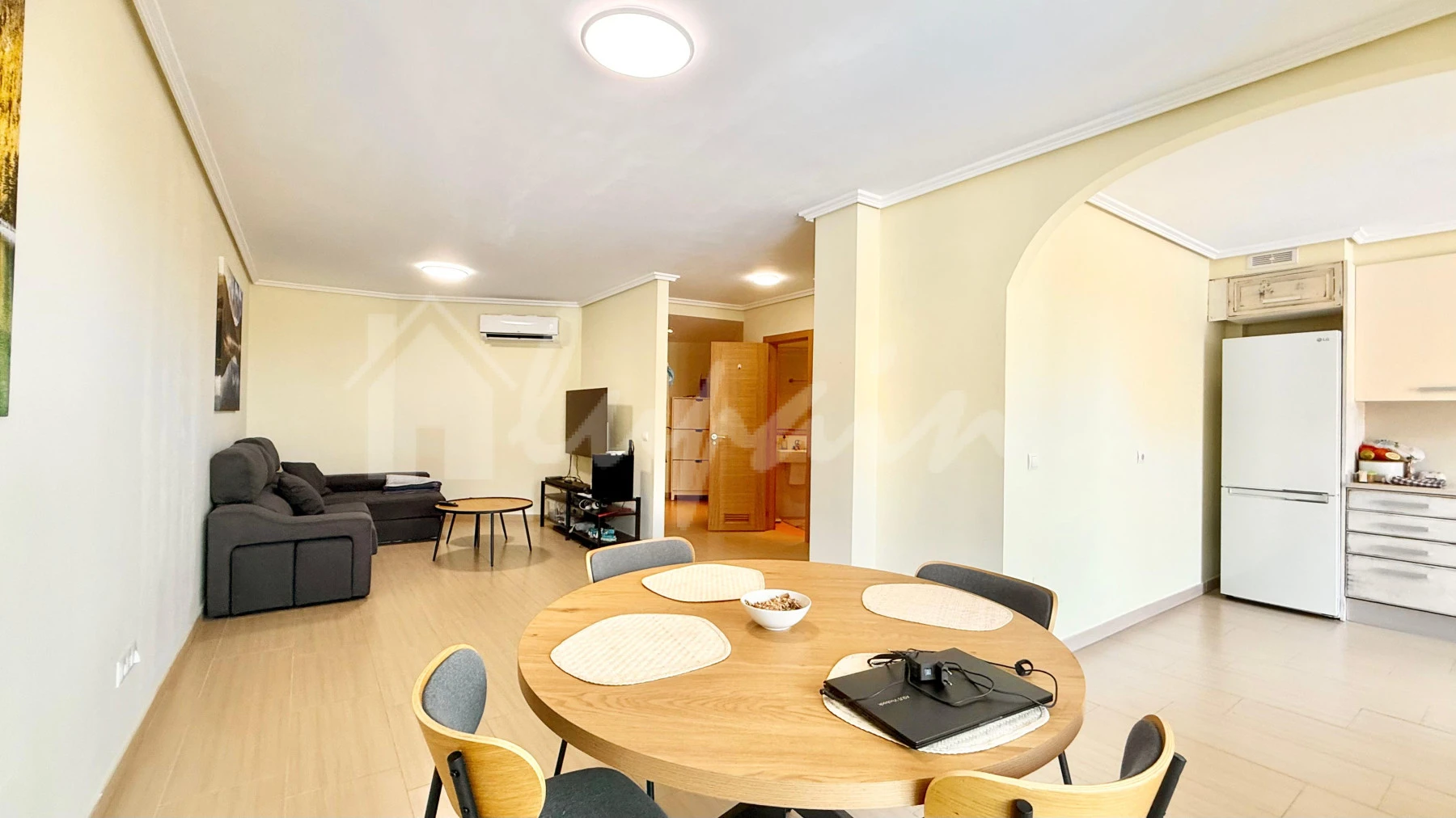 The modern American-style kitchen comes fully fitted and equipped, seamlessly connecting to a bright lounge and dining area. Large patio doors open onto one of the apartment’s three terraces, each offering pleasant views of the communal pool. A private rooftop terrace further enhances the property, boasting spectacular sea and mountain vistas.